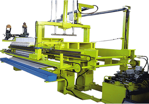 Yo-tana Fully Automatic Filter Cloth washer system consists of hydro motor driven washer trolley constructed of structural steel, sliding on specially designed side bars having UHMW slide, fixed on both sides of filter press side bars. The vertical washer hyd. Cylinder is fixed on the center of the washer trolley for the vertical movement of washer nozzles head.
